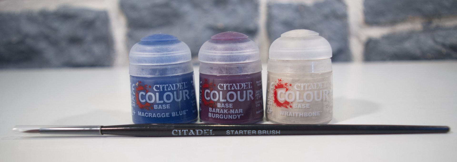 maccrage blue + wraithbone + Barak-Nar Burgundy + Citadel Starter Brush