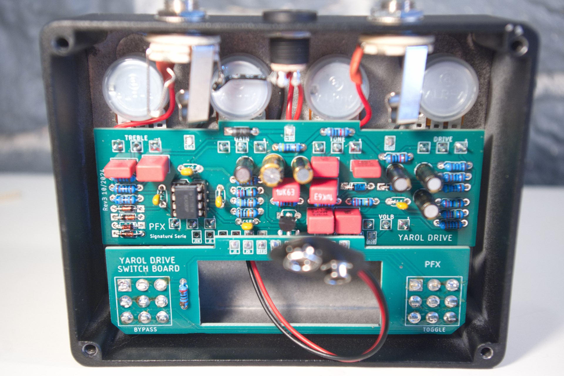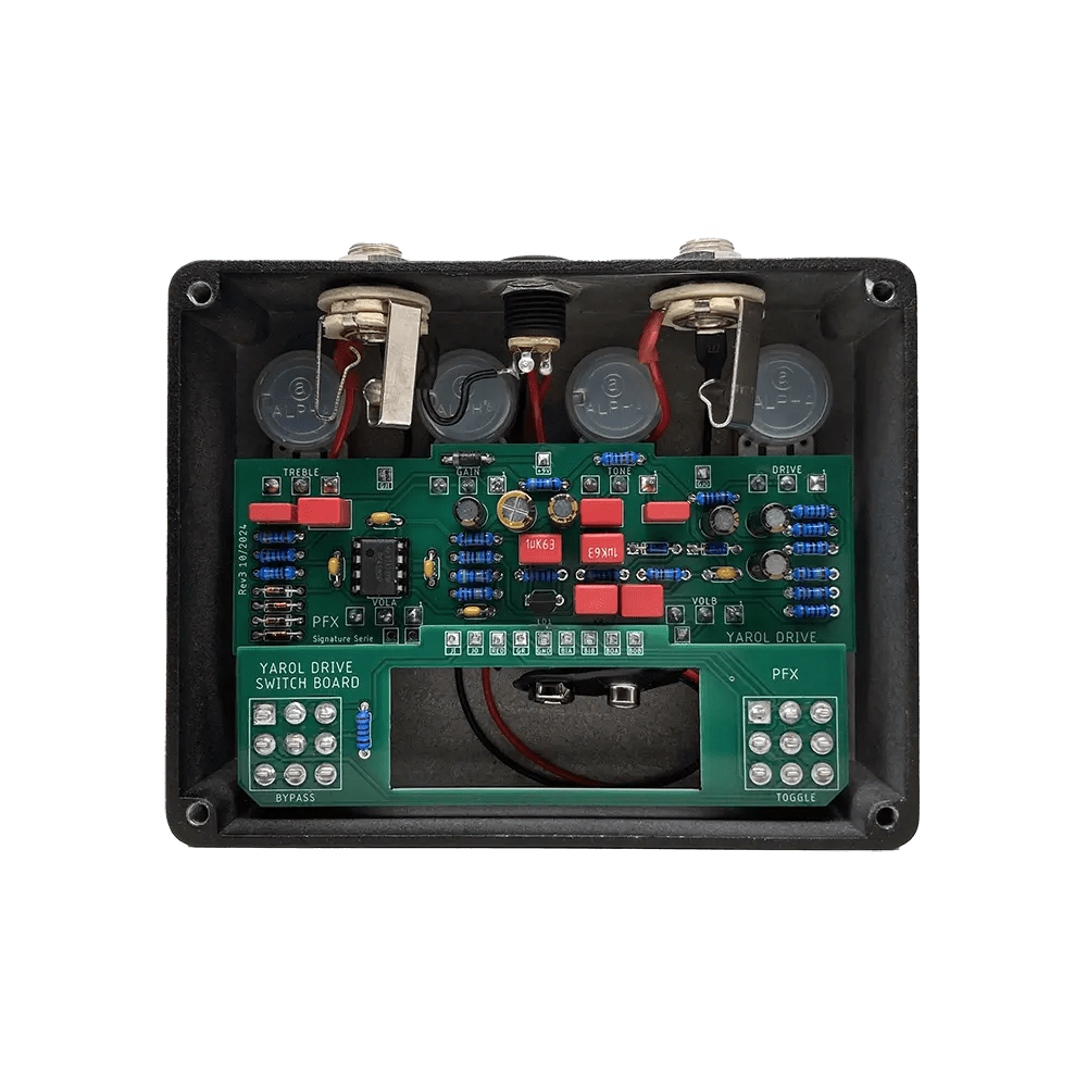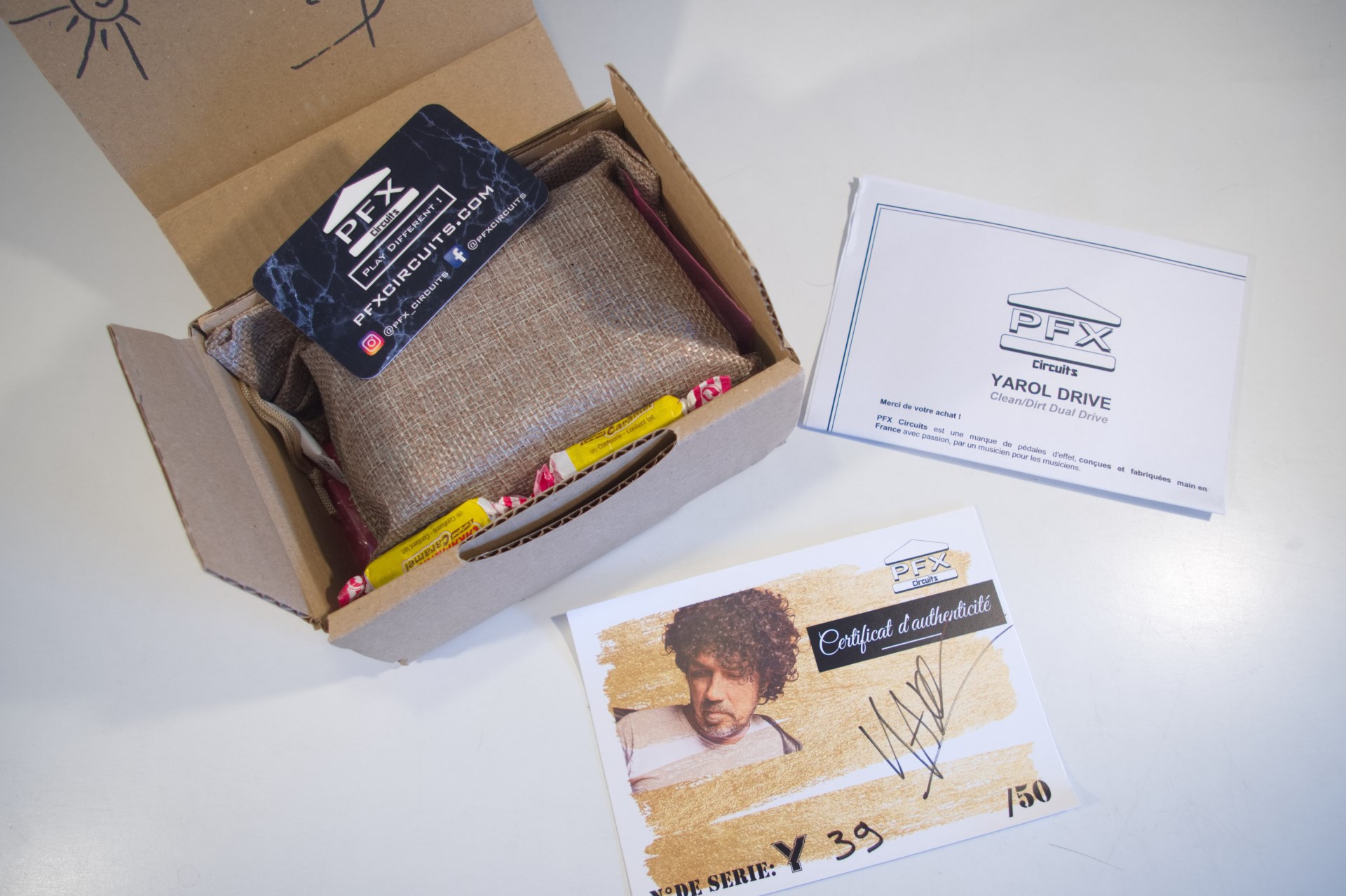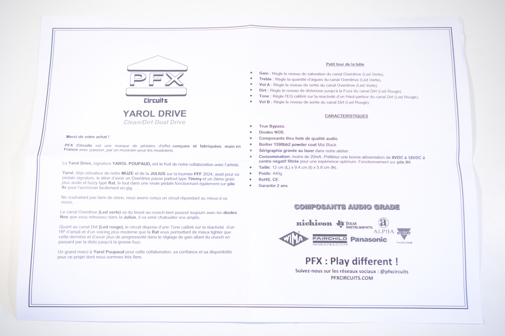 Conçue et produite en France, la pédale d'effet PFX CIRCUITS Limited Edition Yarol Drive est le modèle signature de Yarol Poupaud, émérite guitariste français. Proposée en édition limitée à 50 exemplaires, la Yarol Drive est une saturation à la fois traditionnelle et flexible.
