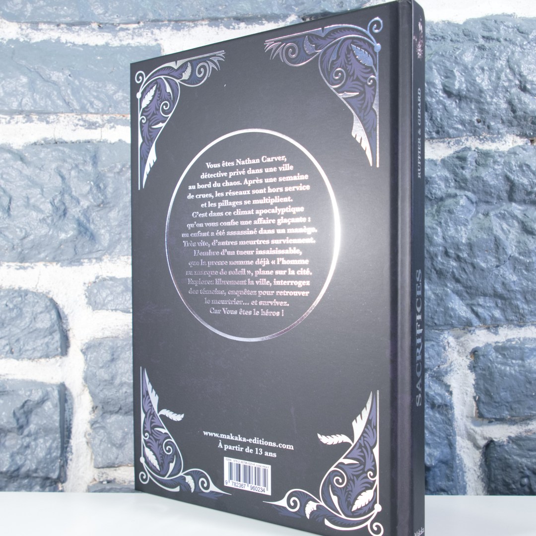 « Sacrifices » sera imprimé au format 18.5 x 27 cm, avec une couverture cartonnée. Avec 144 pages et 50 illustrations, il sortira d'ici la fin de l'année 2025. Le livre s'adresse aux joueurs confirmés, âgés de 13 ans minimum. Il devrait combler les amateurs de jeux de rôles et de livres dont vous êtes le héros.