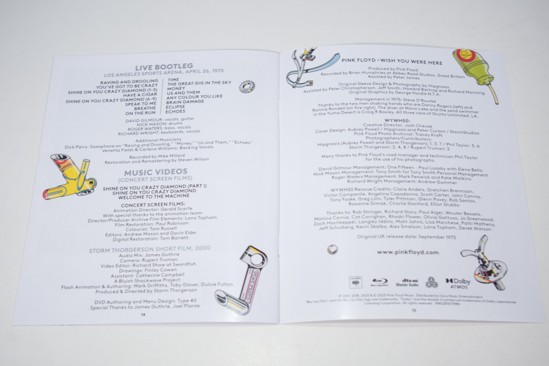 Wish You Were Here 50 will be released in multiple formats including 3LP, 2CD, Blu-ray, digital and a Deluxe Box Set. Pre-order here. The digital release includes the original 1975 album, featuring a new Dolby Atmos mix by James Guthrie, whose work with Pink Floyd dates back to 1979’s The Wall. It also includes 25 bonus tracks made up of nine studio rarities, and 16 live recordings captured by the renowned bootlegger Mike Millard at Pink Floyd’s Los Angeles Sports Arena concert on April 26th 1975, now receiving its first official release. The live audio has been meticulously restored and remastered by Steven Wilson. The Blu-ray edition also gives fans the chance to see three concert screen films from the band’s 1975 tour, plus a Storm Thorgerson short film. The 3LP and 2CD formats include the original album and the nine studio bonus tracks. The Deluxe Box Set includes all 2CD, 3LP (on exclusive clear vinyl) and Blu-Ray material, plus a fourth clear vinyl LP, Live At Wembley 1974, a replica Japanese 7” Single of Have A Cigar b/w Welcome To The Machine, a hardcover book including unseen photographs, a comic book tour programme and Knebworth concert poster. Exclusive 50th Anniversary Merchandise along with Limited Edition product releases will also be available at PinkFloyd.com.
